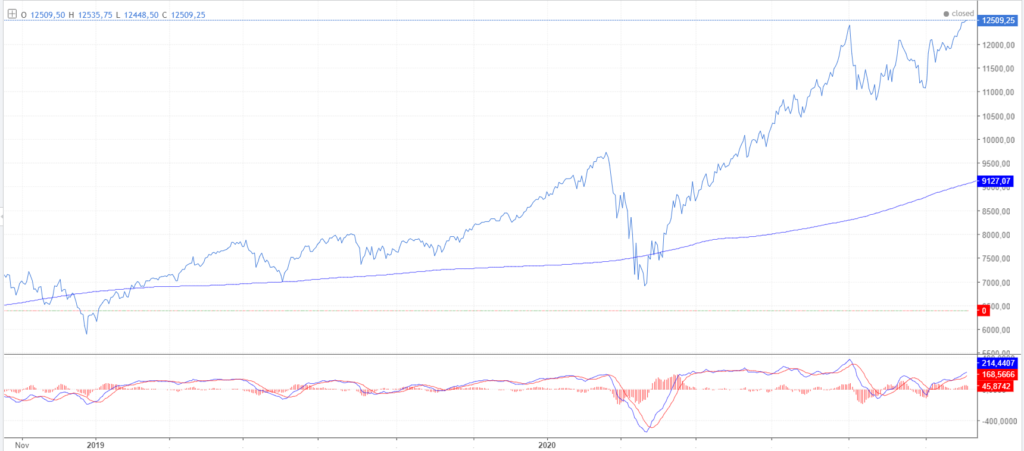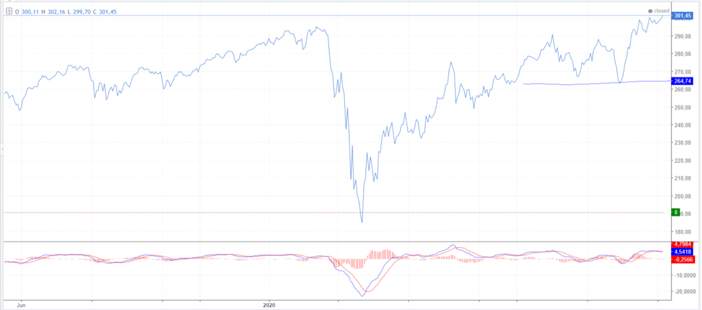 The traffic light is made up out of a few indexes. We have the major indices: the Dow Jones Index, the S&P 500 Index, the Nasdaq 100 and a few indicator indexes: the Vix (volatility Index), the Baltic Dry (transportation index), and the IPSOS GCC (global consumer confidence index). Than we let loose some simple indicators on them. The SMA300, and MACD.
